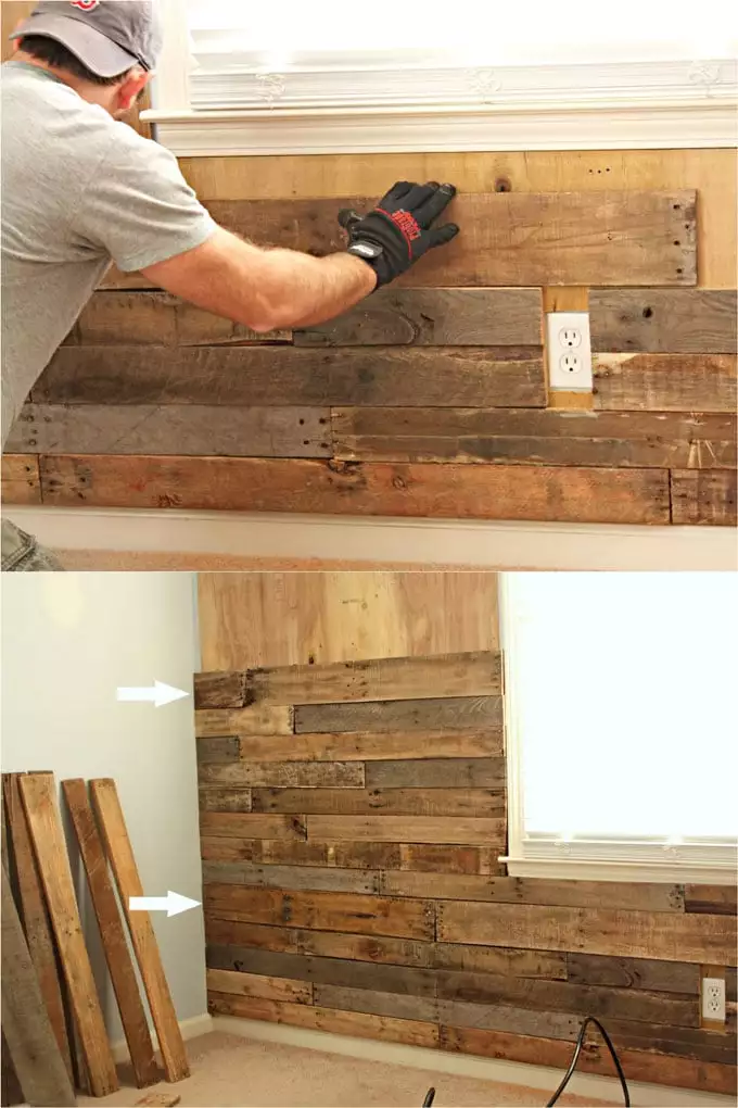 ¿Madera sobre madera? ¡Eso suena como una buena idea! Puede instalar una pared de paletas encima de su madera contrachapada para cubrir piezas delgadas de madera contrachapada detrás de ella.