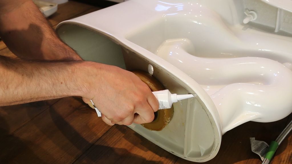 ¡Estupendo! Ahora está listo para instalar su nuevo inodoro. Asegúrese de quitar el trapo de la tubería, levante el inodoro y colóquelo sobre la brida de esta manera. El objetivo aquí es alinear los pernos con los agujeros lo mejor que pueda y luego baje el inodoro en su lugar.