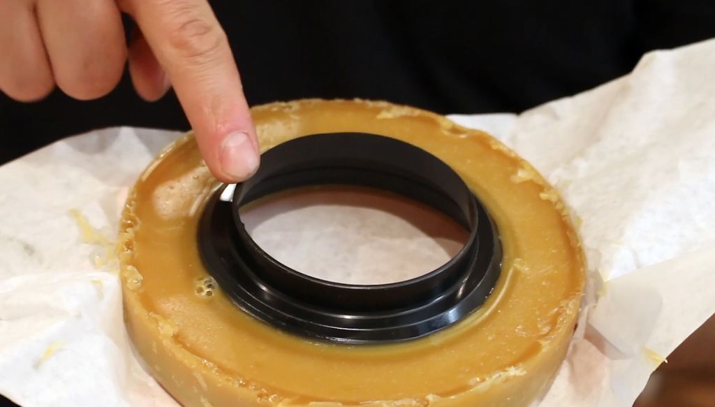 Ahora, use su raspador de plástico para quitar toda la cera residual hasta que se vuelva limpia así. Desea asegurarse de que su instalación sea perfecta, así que tómese el tiempo para eliminar todo solo para asegurarse. Muchos aficionados al bricolaje colocarán su nuevo sello de cera en la brida, pero prefiero colocarlo debajo del inodoro, ya que está 100% seguro de que está alineado con la salida de desechos del inodoro.