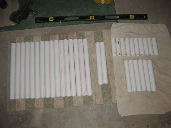 Corte la Tubería de 1-1/2″ en las siguientes secciones: Cantidad Longitud (pulgadas) Longitud (centímetros) 16 22 pulgadas 56 cm 6 12 pulgadas 15 cm 2 16 pulgadas 40.5 cm 10 7 pulgadas 25.5 cm