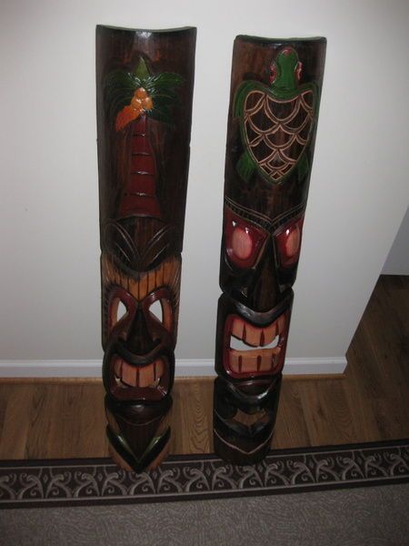 - Máscaras Tiki: Até tiras de velcro a la parte posterior de las máscaras Tiki en la parte superior e inferior con un poco de pegamento y una pistola de grapas, luego pasé el velcro por la cerca de bambú y alrededor del poste de PVC para sujetarlos firmemente a la barra.