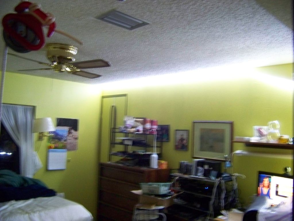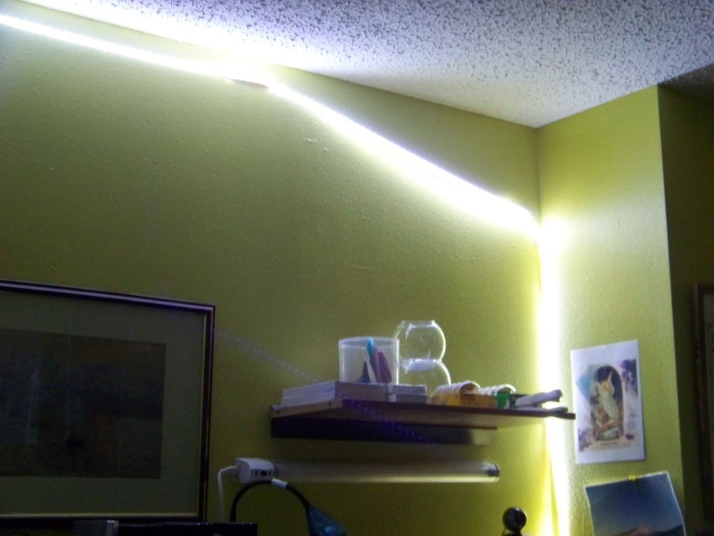 De eBay compré iluminación 5M 16.4ft 5050 SMD 300 LED Impermeable Tira de luz 12V + Controlador de potencia cada cuerda dibuja alrededor de 2.5 amperios. estas cuerdas son a prueba de salpicaduras de agua y tienen un respaldo autoadherente. quitando la protección de la espalda, coloqué la cuerda a lo largo de la parte superior de la pared en un lado de la habitación. al final conecté el adaptador de potencia a un receptor x10 para operación remota. el control remoto es de un botón para un interruptor de luz.
