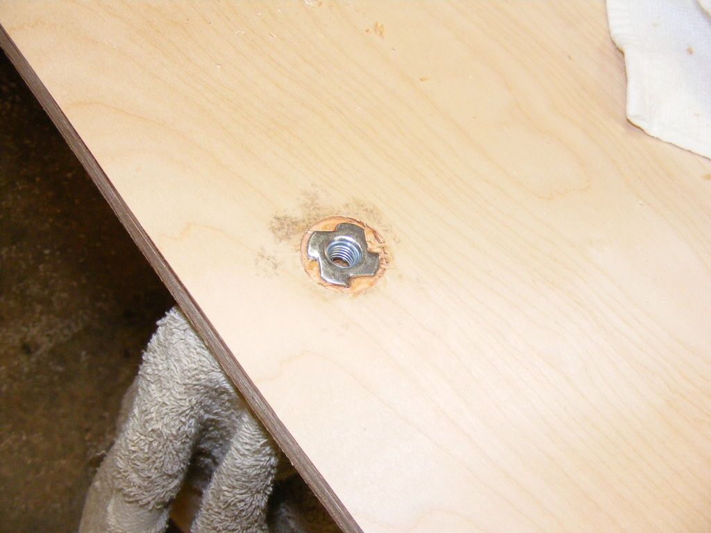 Un mejor plan sería ir unas pulgadas más lejos desde el frente, para que las patas puedan rotarse y quitarse sin quitar el ángulo de aluminio. Una vez que taladre los agujeros, ponga una pequeña cantidad de pegamento alrededor del orificio y golpee suavemente las tuercas.
